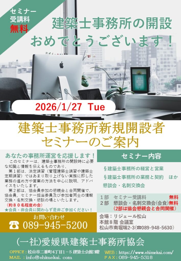 このセミナーは、建築士事務所の開設時に必要な知識と情報を伝えるものであり、